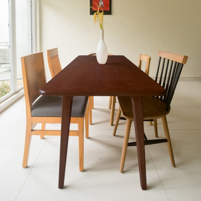 Meja makan minimalis yang menonjolkan warna kayu brown. Cocok untuk ukuran rumah ataupun apartemen.